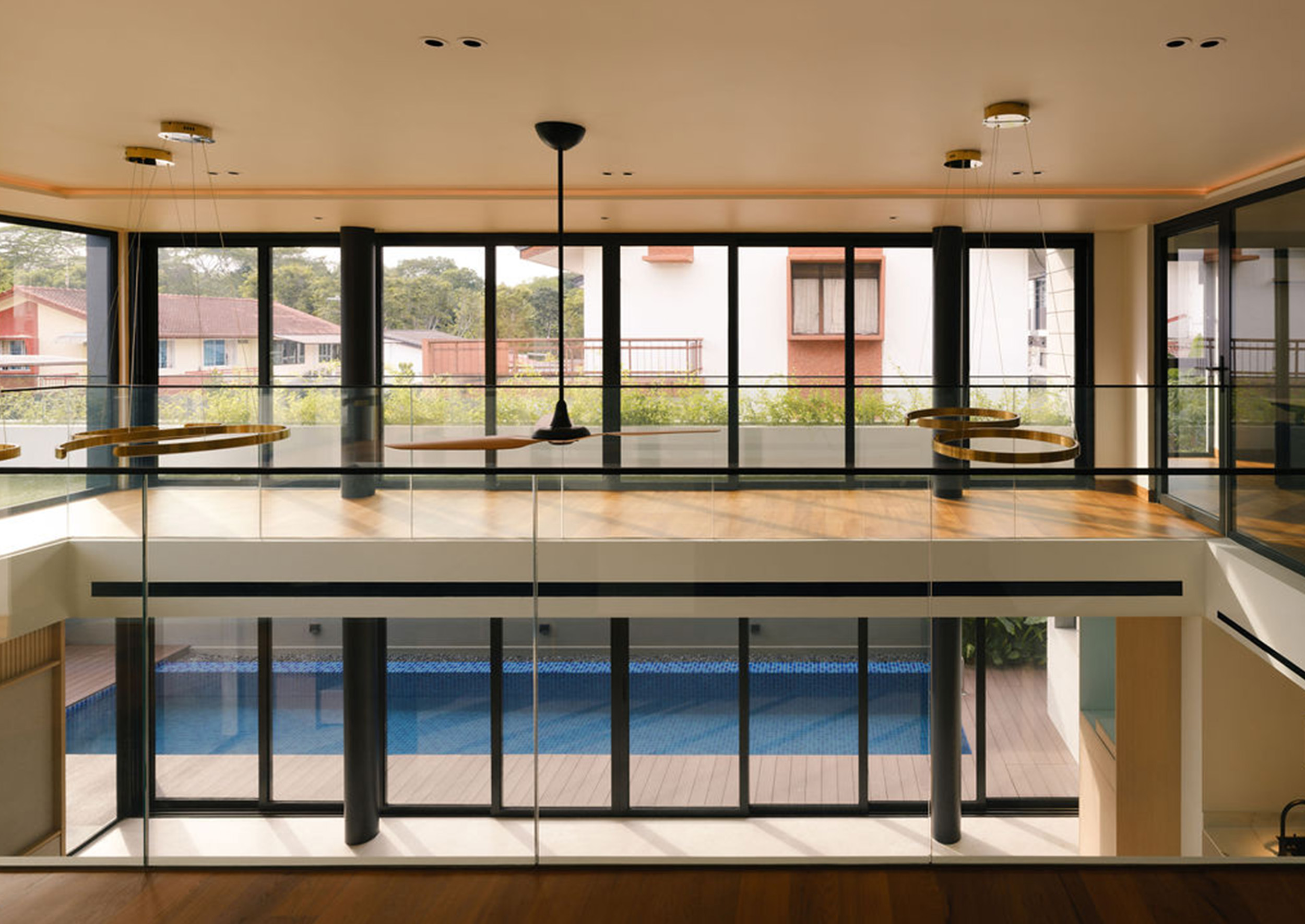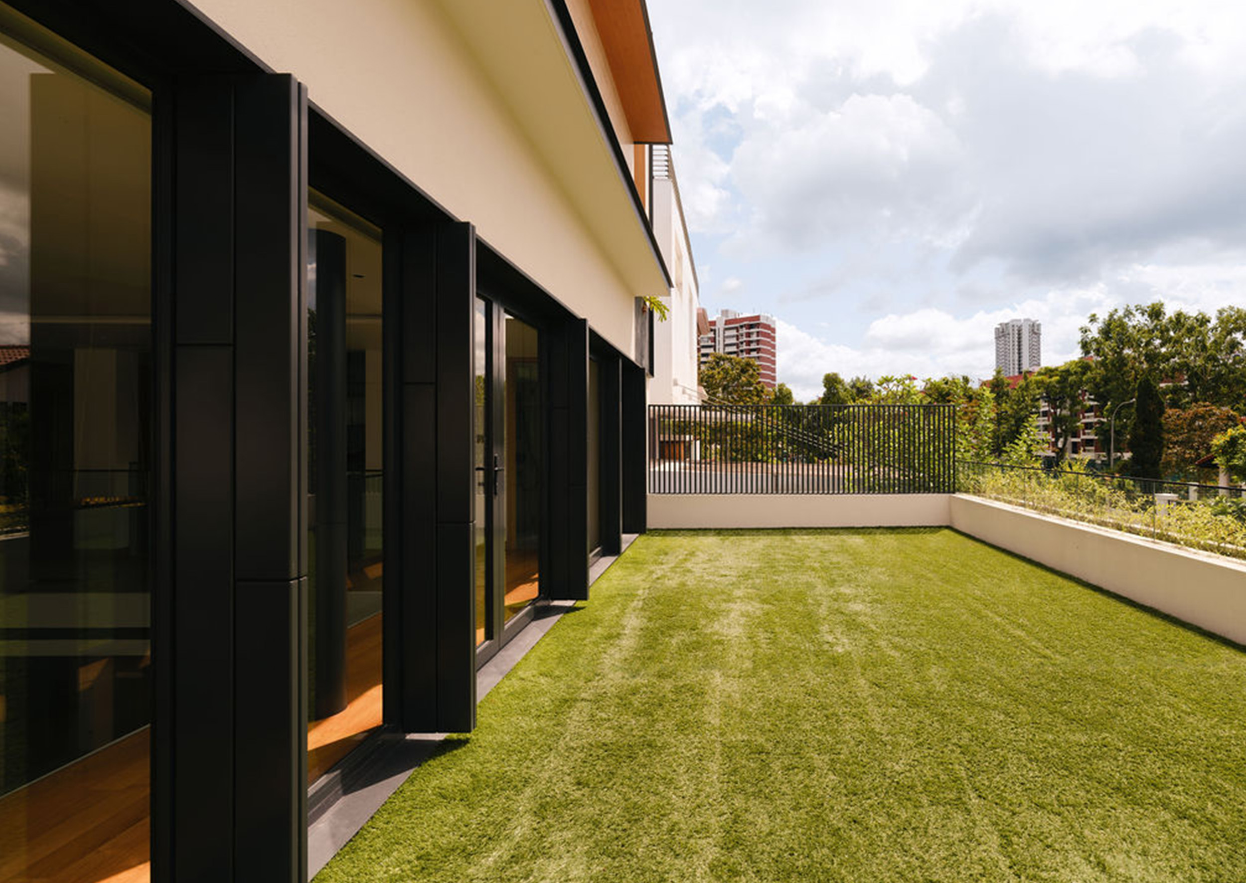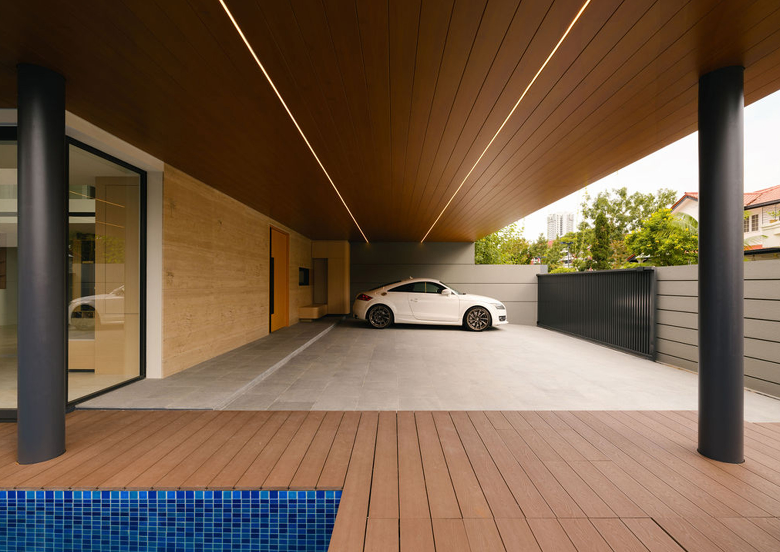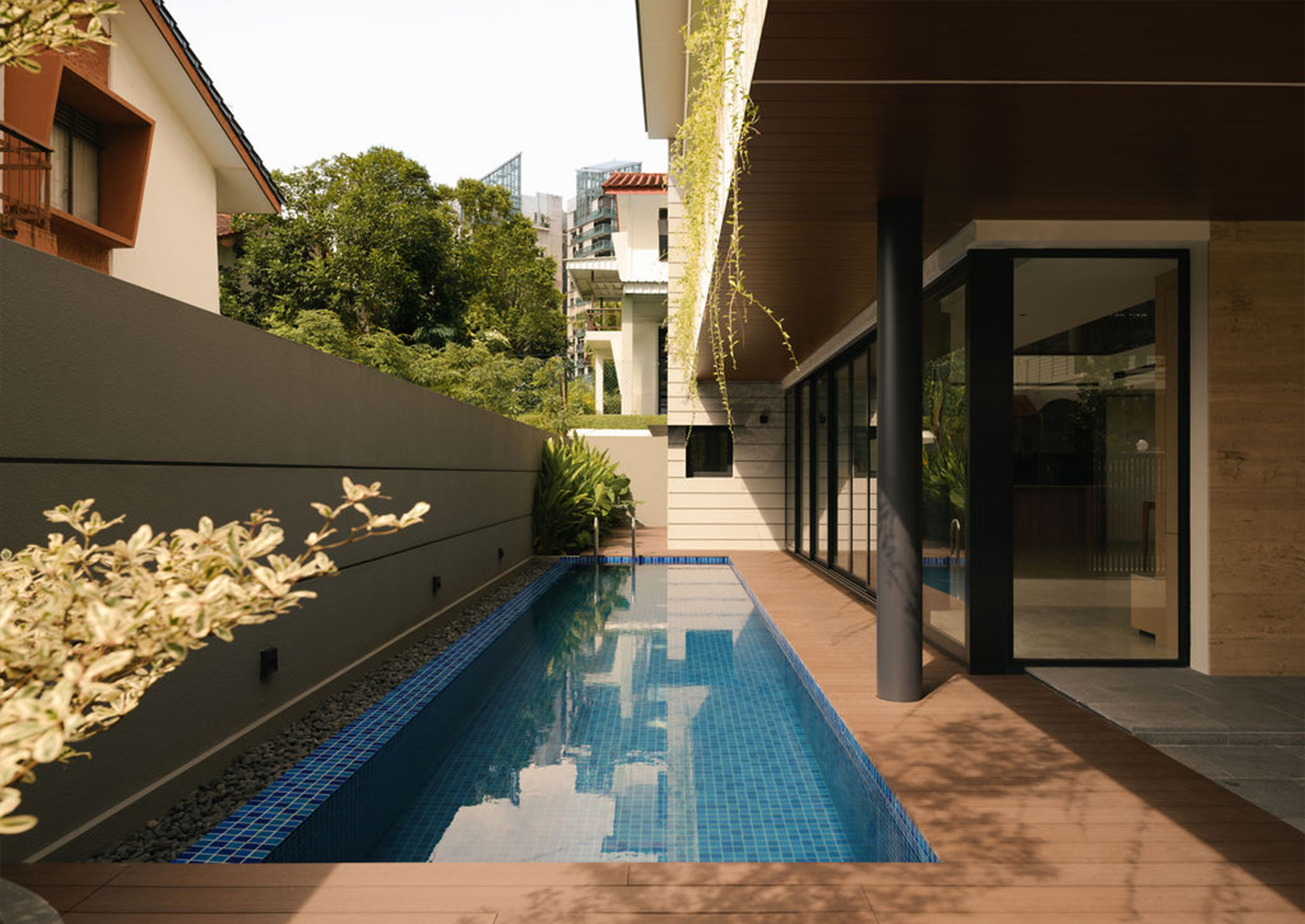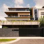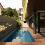 This fluid connection between indoors and out enhances cross-ventilation and bathes the interior in natural light, typical of a tropical-modern home concealed discretely behind the social spaces lies the function wet kitchen, catered for Asian cooking, along with a maid’s room and bathroom tucked away for privacy. A feature wall hides the household shelter and blends seamlessly with lift panels.