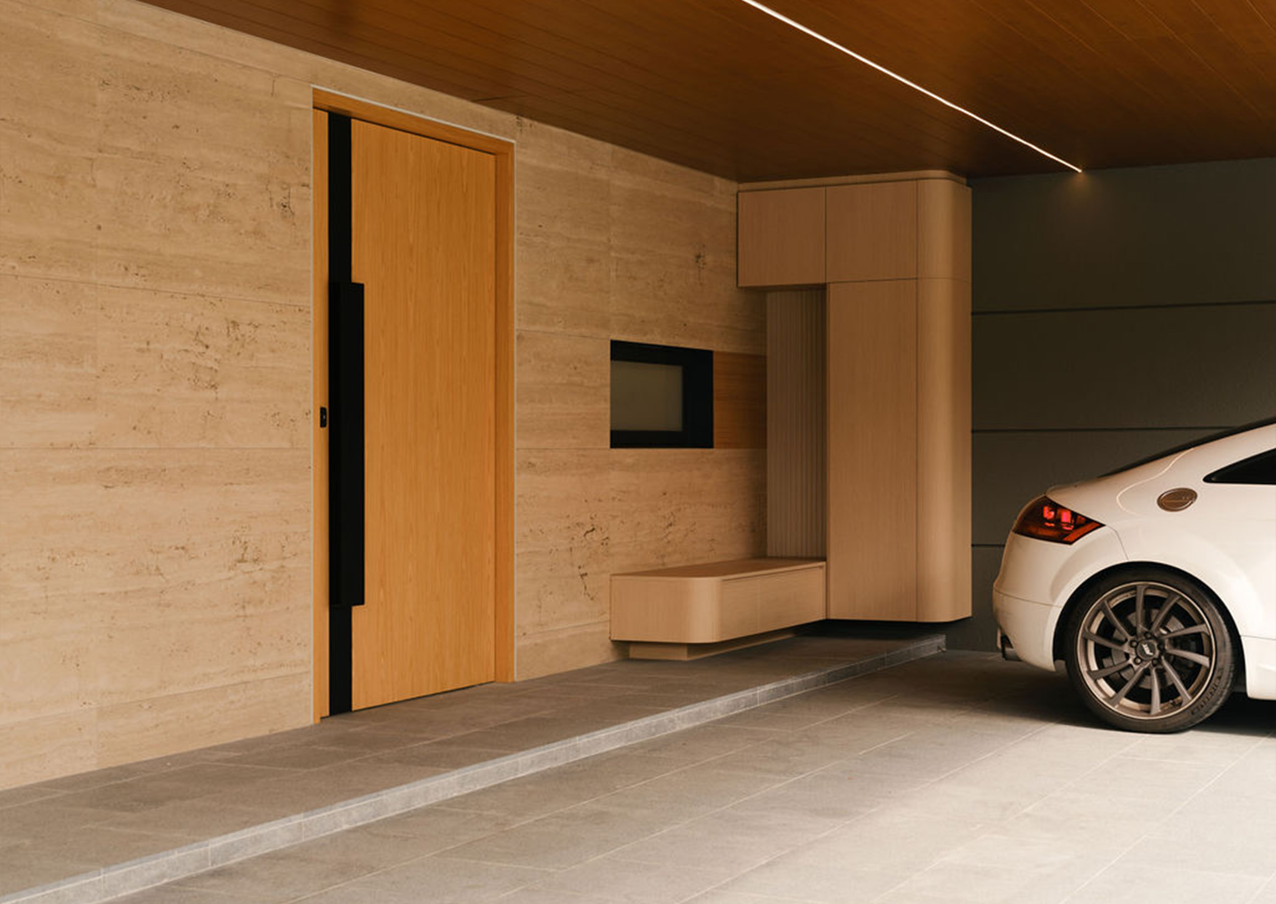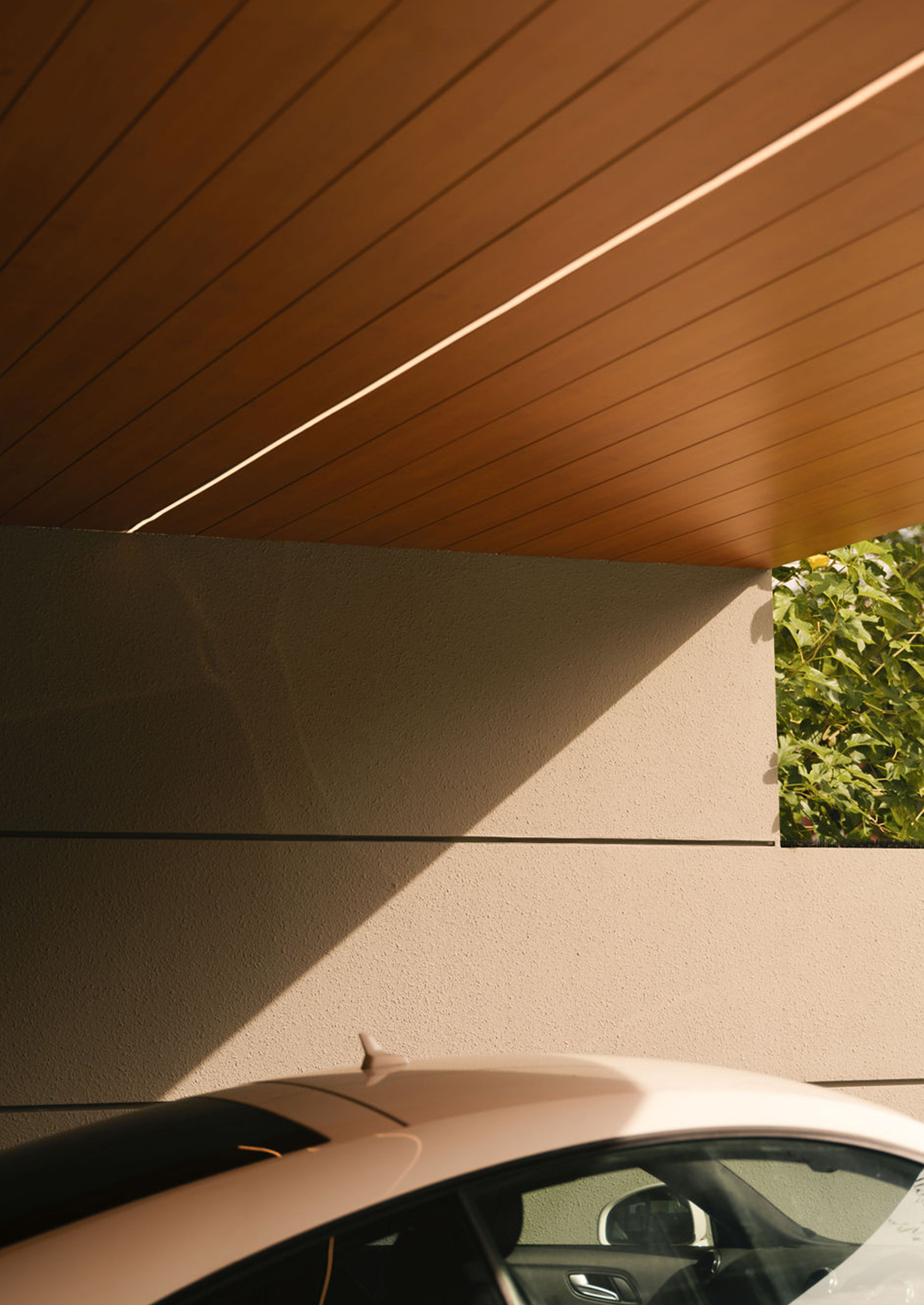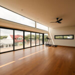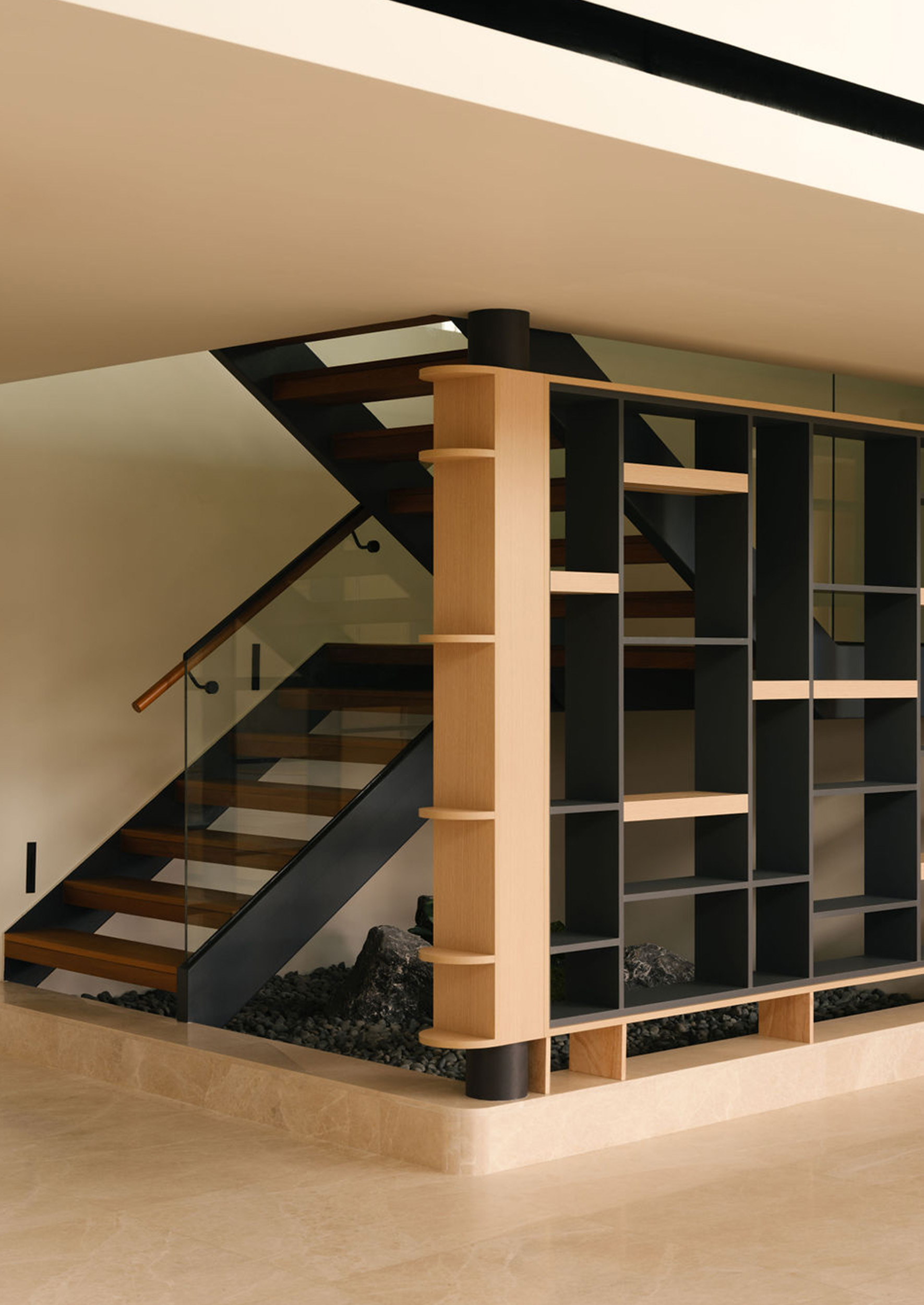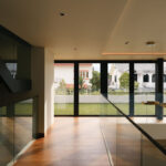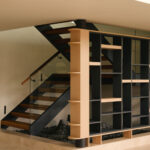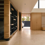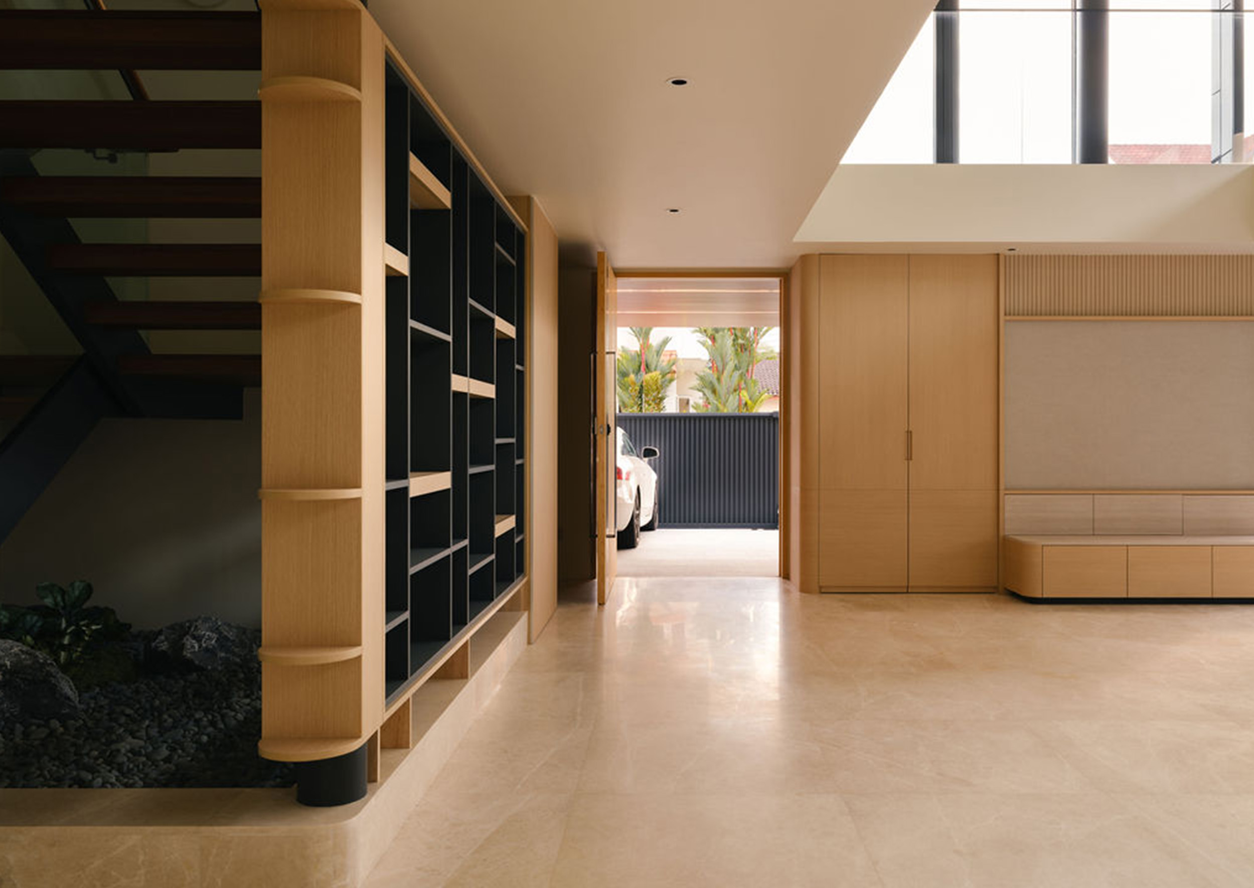 A striking open-riser staircase acts as a sculptural feature, connecting throughout the home’s levels. The stair is screened by a artfully designed display shelves that allows the display of the owner’s photos and souvenirs from their overseas holidays.