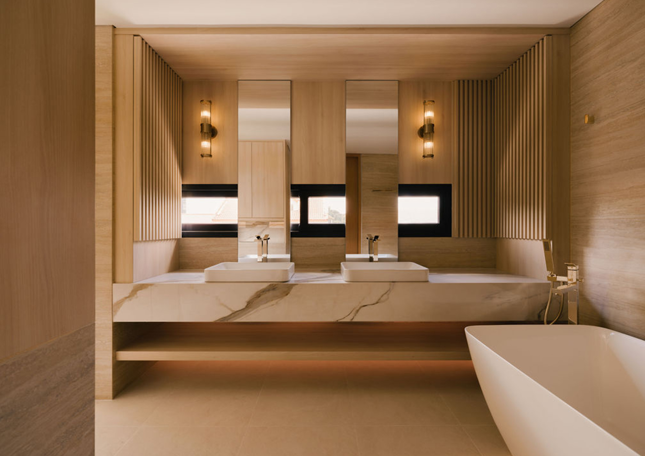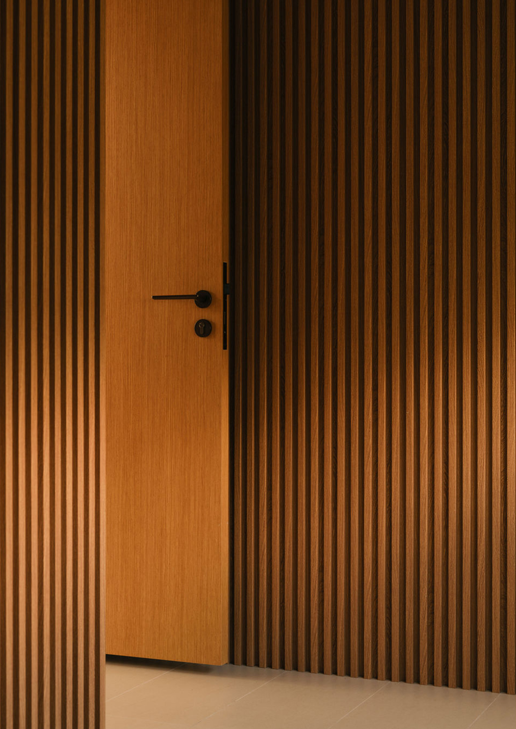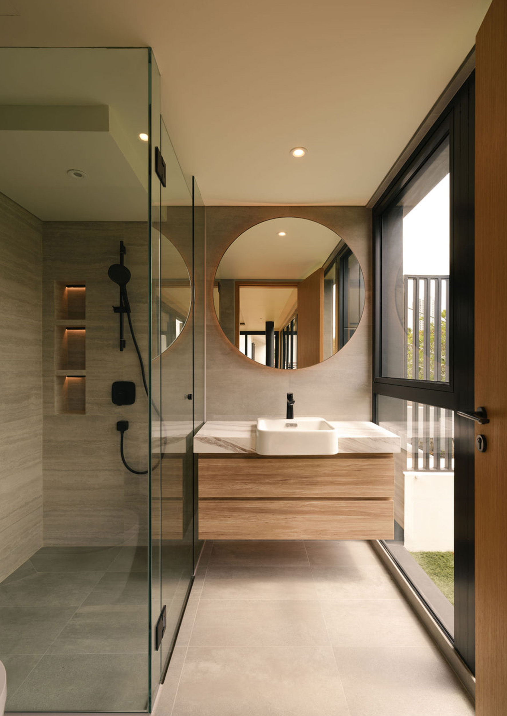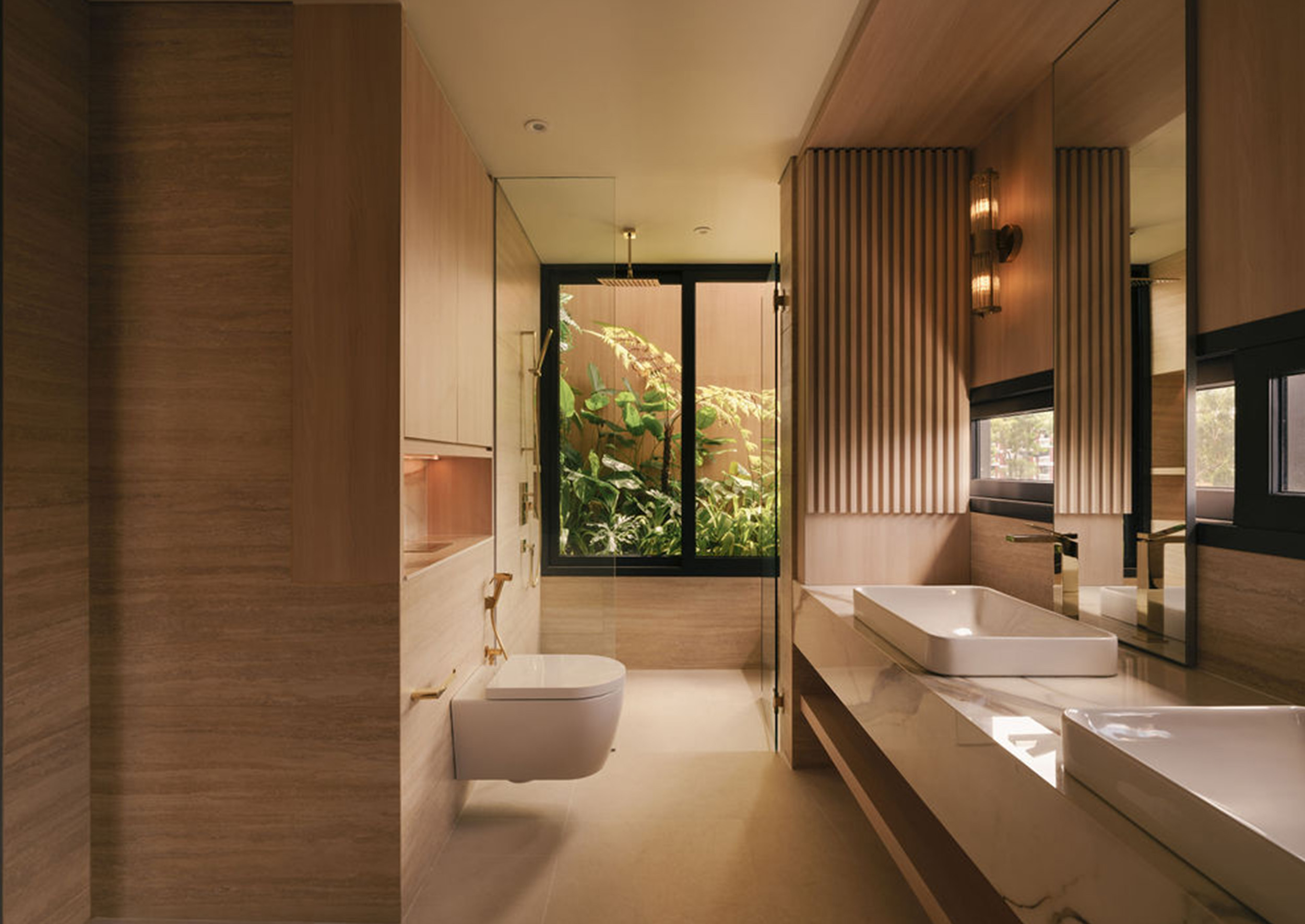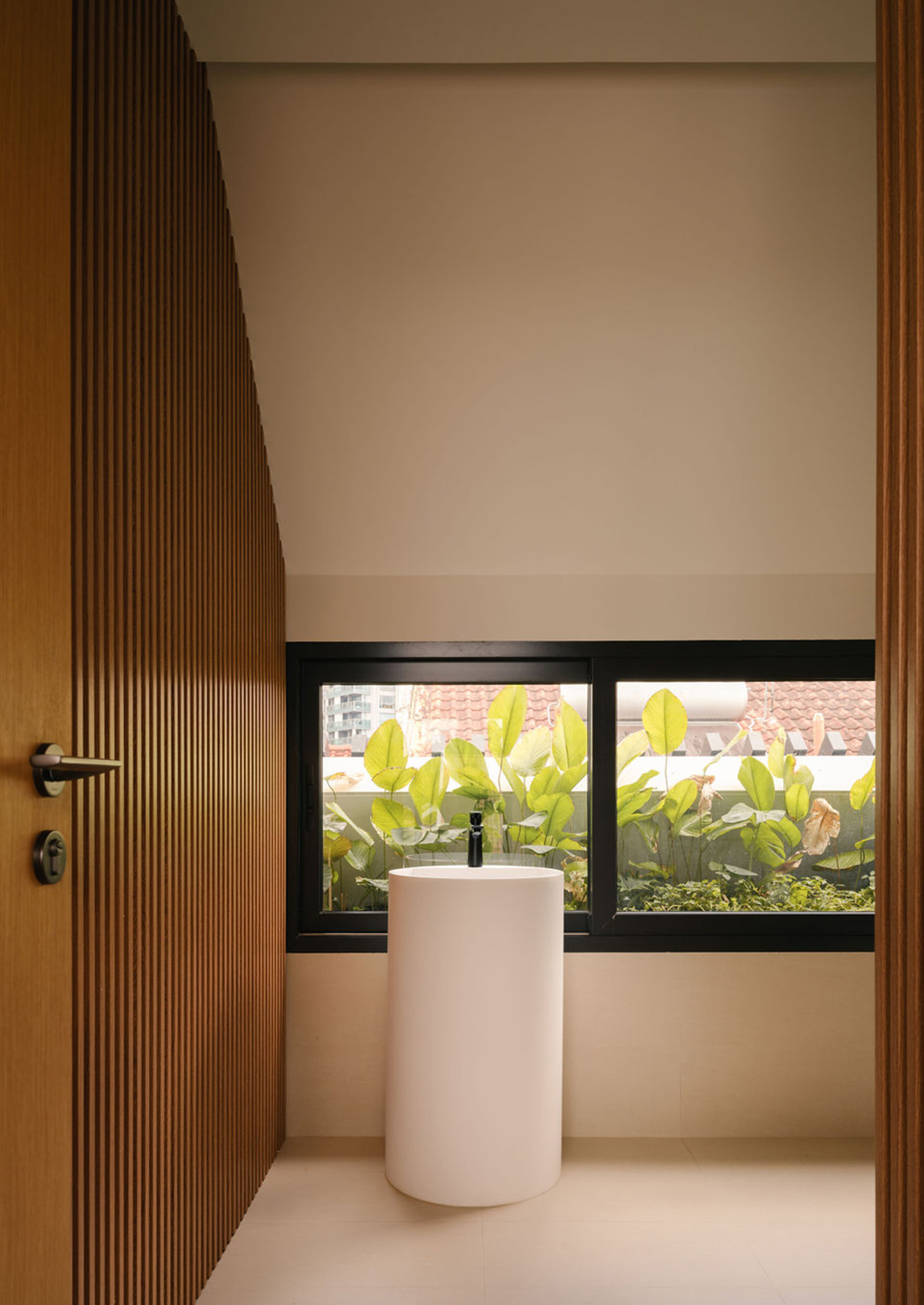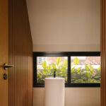 The second floor is dedicated to restful private spaces. The master bedroom is a luxurious retreat complete with a double basin bathroom that features a rain shower with a unique view – framed look to a lush green wall, bringing the outdoors in even during moments of solitude. Two additional bedrooms each have their own ensuite bathrooms, as provided for the children of the owners.